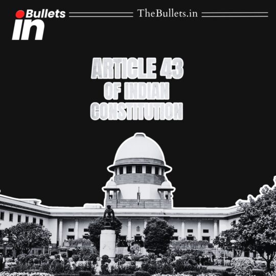 Constitution of India के भाग IV में अनुच्छेद 43 राज्य को निर्देश देता है कि वह श्रमिकों के लिए जीविकोपार्जन योग्य वेतन, सम्मानजनक कार्य परिस्थितियाँ, अवकाश तथा सामाजिक-सांस्कृतिक अवसर सुनिश्चित करे और ग्रामीण कुटीर उद्योगों को बढ़ावा दे। यह आर्थिक लोकतंत्र और सामाजिक न्याय की संवैधानिक दृष्टि को दर्शाता है। BulletsIn नीति-निर्देशक तत्व; न्यायालय में